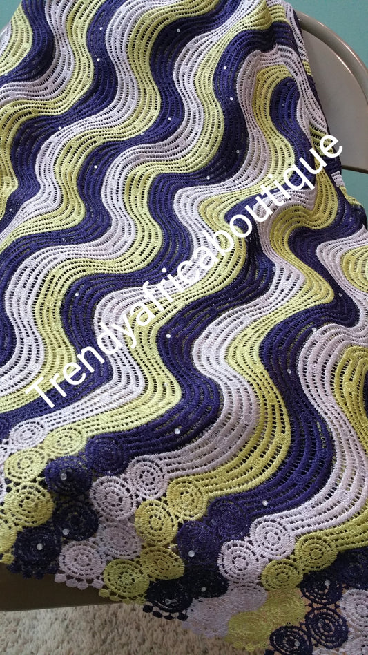 Clearance: Yellow/royal blue Cord-lace fabric. Soft Quality African/swiss lace. Sold per 5yds.