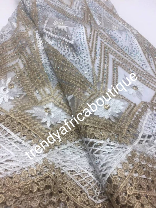Latest design: African French lace/guipure-lace fabric embellished with beads & crystal stones all over to perfection. Sold per 5yds. Nigerian Bridal lace fabric white/gold.