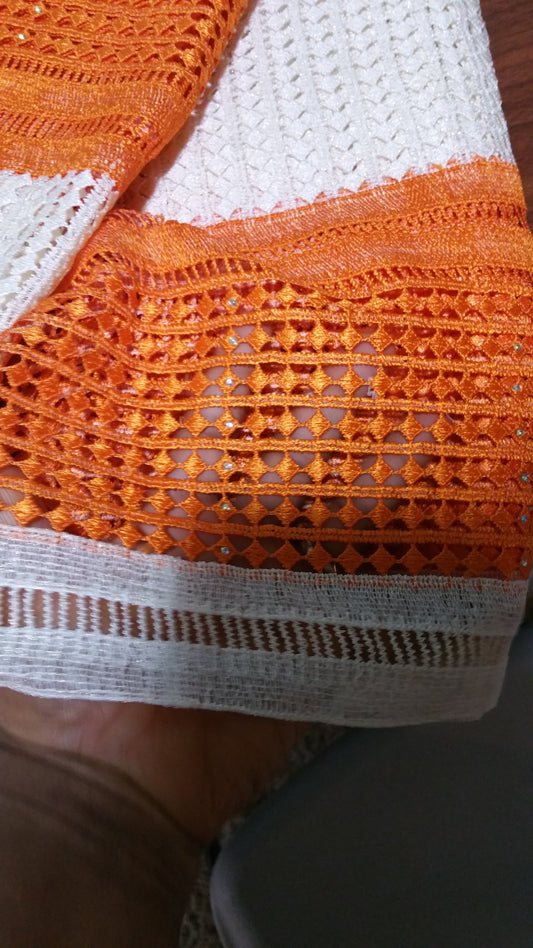 • Clearance: Cream/Orange Cord-lace fabric for makimg Nigerian party dress. Sold per 5yds. Price is for 5 yds. Beautiful guipure-lace with stones