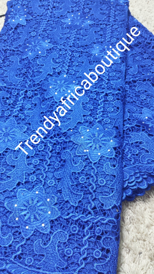 Royal blue Cord-lace fabric with stones for Nigerian party dress. Africa Cord/guipure swiss lace fabric