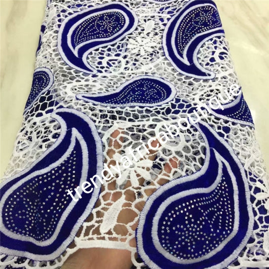 • Royalblue/white cord-lace fabric. Quality guipure lace fabric. Superior quality African Swiss lace. Soft texture. Sold per 5yds lenght