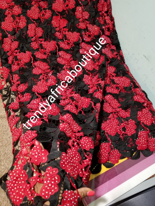 Clearance: soft texture Cord-lace fabric Black/red swiss cord lace fabric. Latest guipure-lace embellished with dazzling crystal stones all over. Sold per 5yds, price is for 5yds. Nigerian party fabric. Original quality