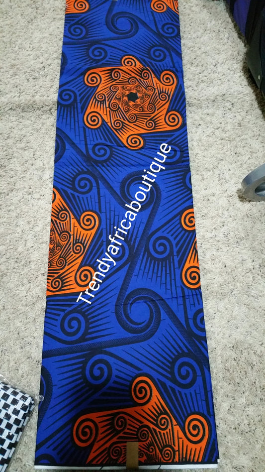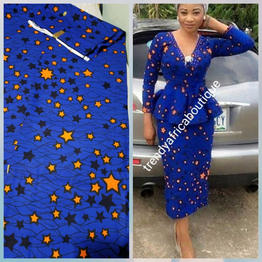 Veritable wax print fabric. Beautiful royal blue/orange stars in 100% cotton. Excellent quality. Sold per 6yds length