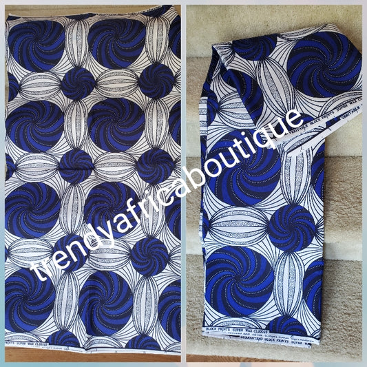 White/royal blue veritable Ankara wax print fabric. 100% cotton. Lustrous quality print sold per 6yds. Price is for 6yds.