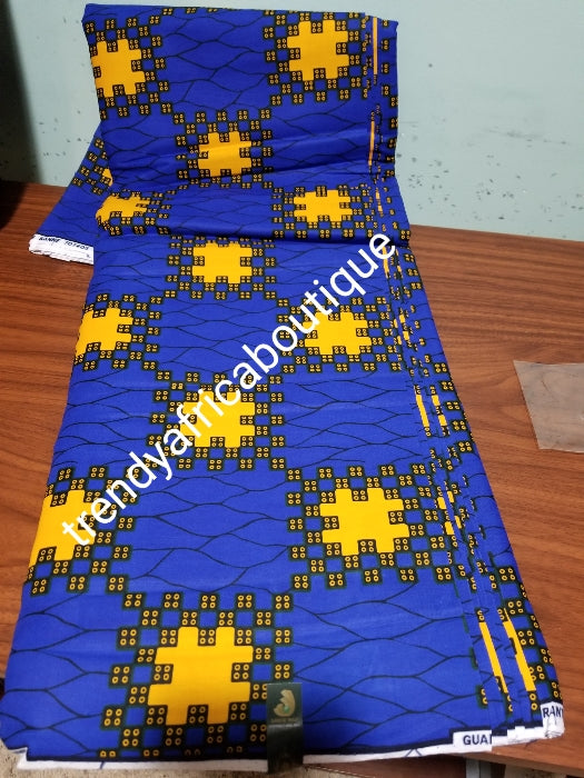 • African wax print fabric in 100% cotton. Beautiful royalblue/yellow ankara. Can be use for men and women dresses Sold per 6yrds. Price is for 6yds.