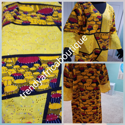 clearance:. Embriodered and stoned Ankara-dress, Long dress embellished with shinning multi color Swarovski stones to perfection! Fit Burst 48" and Full lenght 59", sleeve lenght 19.5. Made with Quality hitarget Ankara mix with dry lace. Flared sleeves