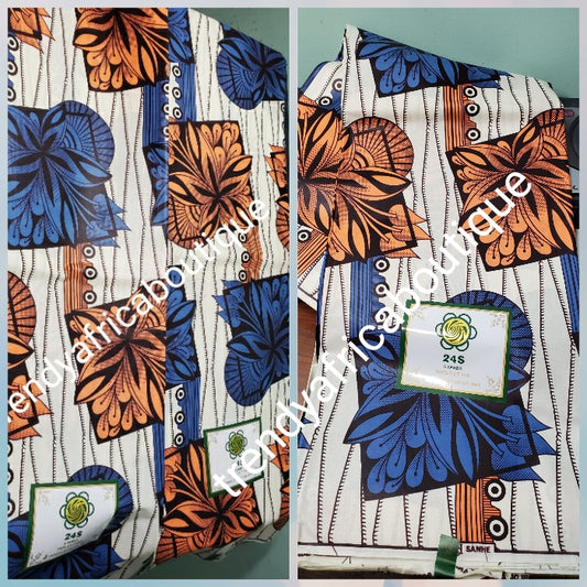 Cream/orange/royalblue Veritable African wax print fabric. 100% cotton Ankara print for making African party outfit for men and women. Sold per 6yds and price is for 6yds. Soft luxurious Quality fabric