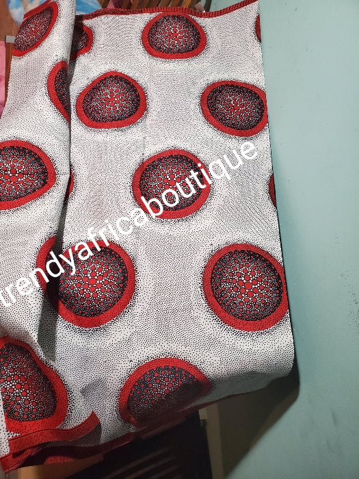 Guarantee real wax print. White/black/red Cotton Ankara. Lustrous quality print sold per 6yds. Price is for 6yds.