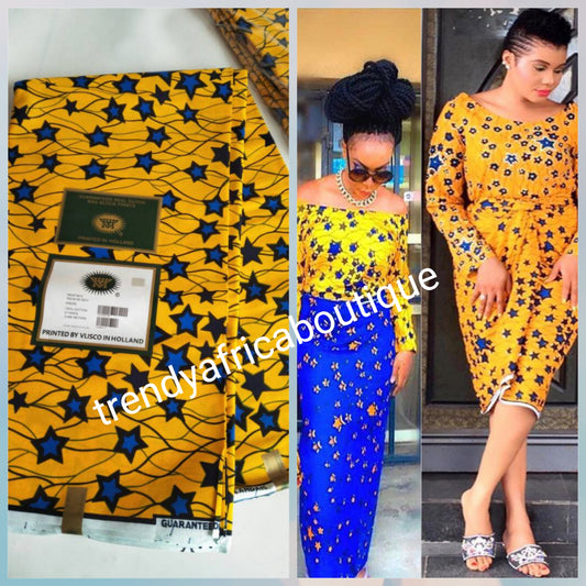 Top quality 100% Cotton Yellow/blue Star ankara Wax-print. Supper quality Hollandaise wax. Sold per 6yds. African/Nigerian cotton Ankara.