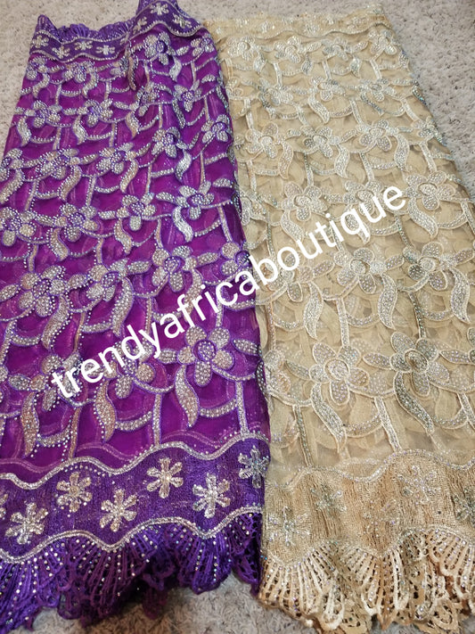 Beige/lilac Net French lace fabric, Luxery Embriodery African french lace fabric. Beaded and stoned to perfection. Sold per 5yds price is for 5yds. Beautiful border handcut embriodery work