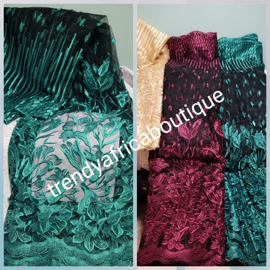 Black/wine Net French lace fabric. Embriodery, beaded and stoned. Flower border. Soft net french lace. Sold per 5yds