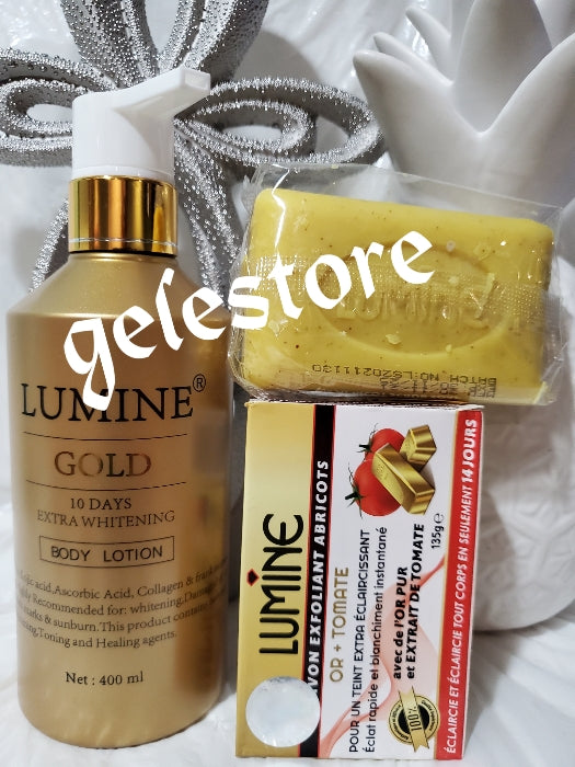 • 3pcs set: Lumine gold face and body lotion 400ml, serum and soap. Extra  whitening with collagen, kojic acid. Tones and heal your skin with  Spf 50. Firming and glowing