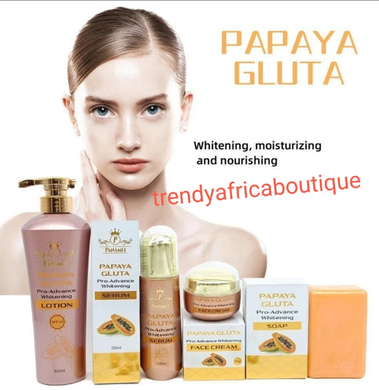 4pcs. Set; Panamei Pro-advance whitening body lotion, serum, face cream and exfoliating soap. Spf 40. Super anti ageing whitening set. Papaya Gluta👍