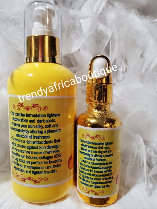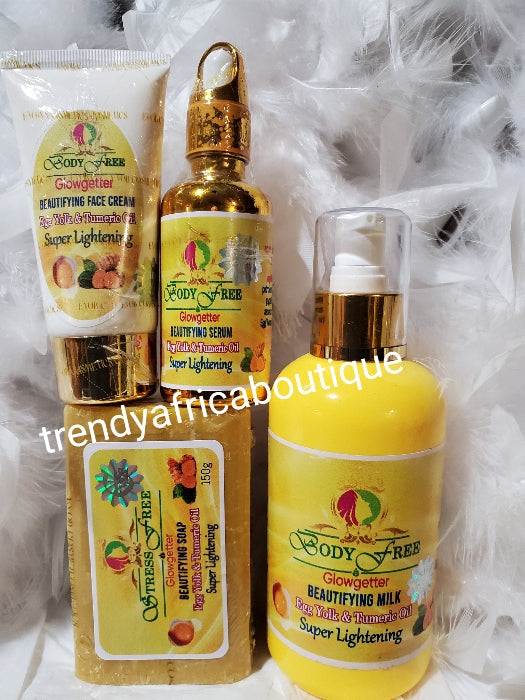 4pcs.2 body lotion and 2 serum: EVOB Yellow Cece Body Free glowgetter beautying milk formulated with Egg yolk, tumeric extracts, KOJIC acid etc. SUPER LIGHTENING . For all skin type.