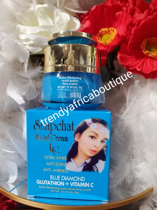 X 1 jar sale: Lait Snapchat diamond blue whitening face cream formulated to keep a younger looking skin. With snail slime, glutathione, vitamin C 50g jar