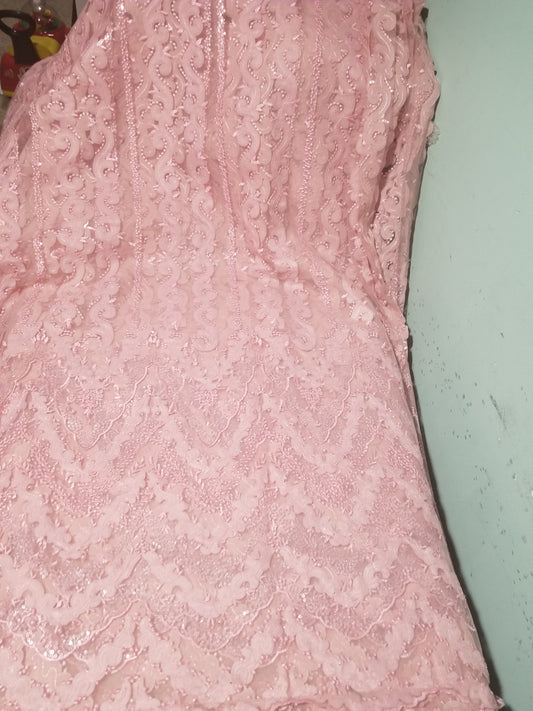 New arrival soft pink net French lace fabric. Quality lace stoned with pearls and sequins. Sold per 5yds. African french lace fabric. Rich quality for wedding dress