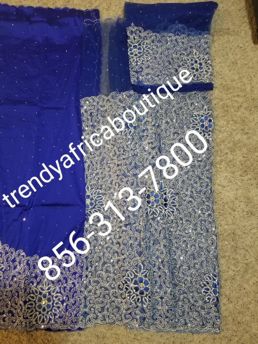 Original quality Royal blue/silver crystal hand stoned VIP celebrant George wrapper for Nigerian Ceremonies such as weddings. Igbo/Niger/ Delta/ wedding George. Set of Net + taffeta+ matching net for blouse. Breath taking crystal work!!!