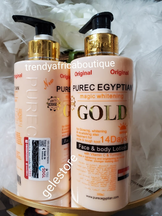 • BEWARE OF FAKE:ORIGINAL Purec Egyptian magic GOLD vitamin C, turmeric, egg yolk & L-Glutathion for face & body 300ml. Fast whitening action! face and body lotion formulated to evenly lighten, and brighten your skin, giving you that natural glow