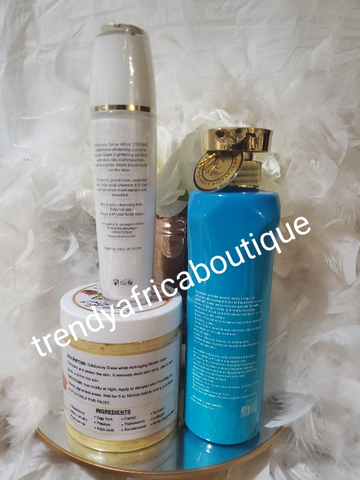 • 🔥🔥🔥 Combo! 3pcs Lait Snapchat diamond blue body Lotion 500ml, Glitzluxury snow white concentre Serum, glitzluxury snow White Anti-aging MOLATO SOAP 500G JAR! Luminous & flawless skin👌.