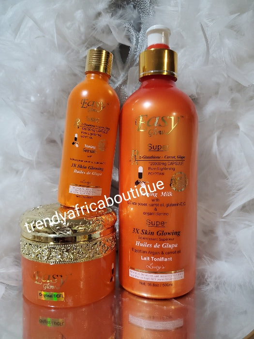 • 3pcs combo:  Authentic Easy Glow strong lightening, toning & glowing body lotion, serum & Facial cream with L-Glutathion & carrot oil extracts 3x skin glowing body