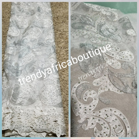 • CLEARANCE ITEM: white French lace fabric with silver lurex and all over crystal stone work. Sold 5yards length