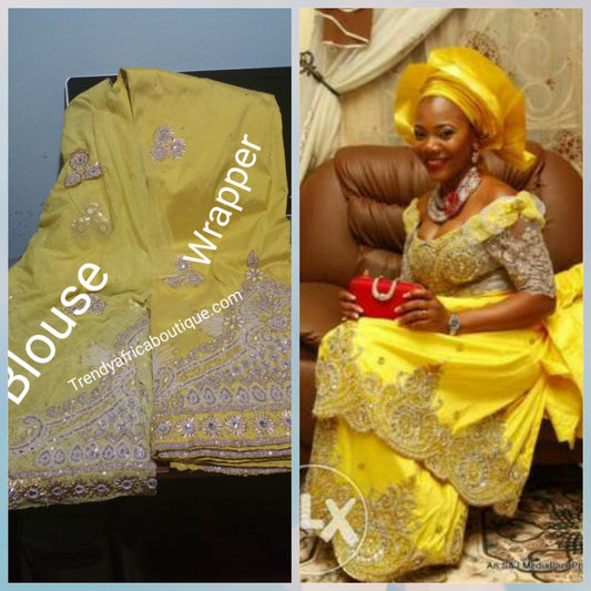 Clearance: Sweet yellow heavily Beaded and Stoned VIP/Nigerian traditional George wrapper. Classic Wrapper for Igbo/Nigerians traditional wedding outfit. Sold as 2 wrapper + 2yds matching net for blouse. Quality guarantee!!!