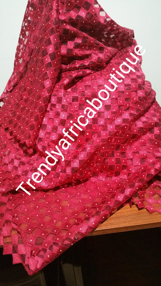 Clearance:African design Net French lace fabric with all over crystal stones. Wine (maroon) Sold 5yrds lenght.