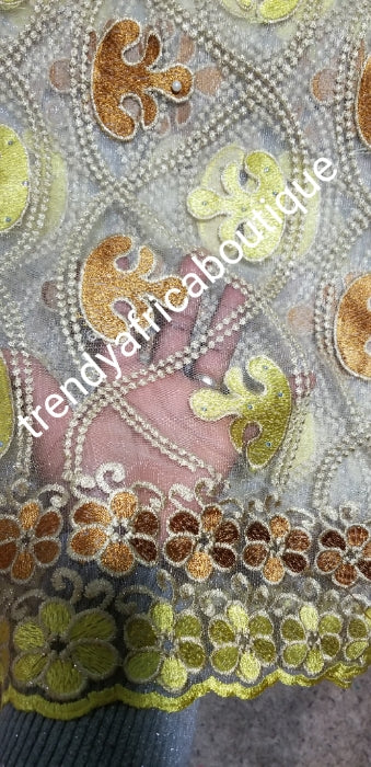 Clearance: African French lace fabric in verbrant yellow. All over crystals stones. Sold per 5 yards.