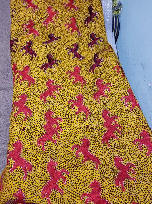 clearance:. Embriodered and stoned Ankara-dress, Long dress embellished with shinning multi color Swarovski stones to perfection! Fit Burst 48" and Full lenght 59", sleeve lenght 19.5. Made with Quality hitarget Ankara mix with dry lace. Flared sleeves