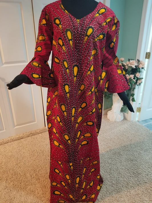 Clearance: red Ankara-dress, embellished with shinning Swarovski stones to perfection! Fit Burst 46" and 59" lenght shoulder to floor. Made with Quality hitarget Ankara. Comes with a matching headtie. Flared sleeves