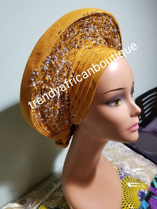 Clearance: Beaded and stoned Gold Auto-gele made with quality Aso-oke. Beaded and stoned work front and back to perfection. One size fit, easy to adjust and knot at the back to secure your gele. This is true original auto gele