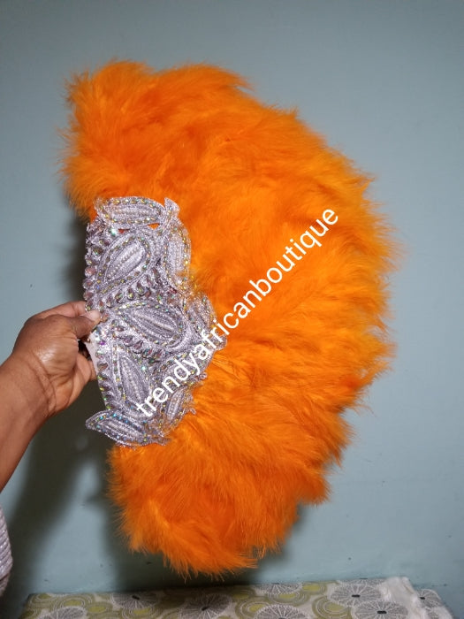 Clearance Orange Feather hand fan. Medium front and back design moon shape hand fan Nigerian Bridal-accessories front and back design with gold beads and flower petal. Limited quantity. 19" long + 14" wide. Small handle to hold your fan. Very classy