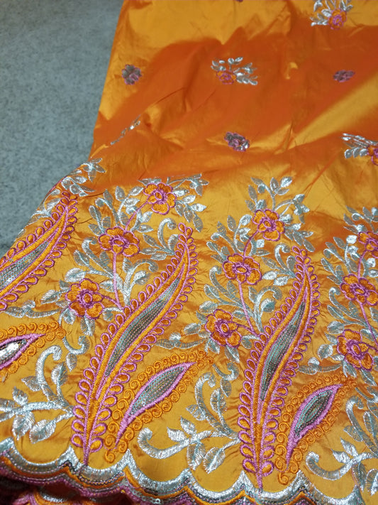 Clearance item: Orange Embriodery silk Geoge fabric. Beautiful flower border. Original quality George for making African party dress. Indian-George sold per 5yards and price is for 5yds