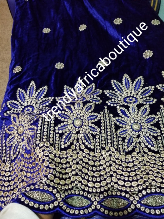 Clearance item. Royal blue embriodery VELVET wrapper embellished with gold sequine. Classic for making Nigerian traditional 1st outfit for Bride. Sold per 2.5yds/price is for 2.5yds. Edo/igbo Bride outfit