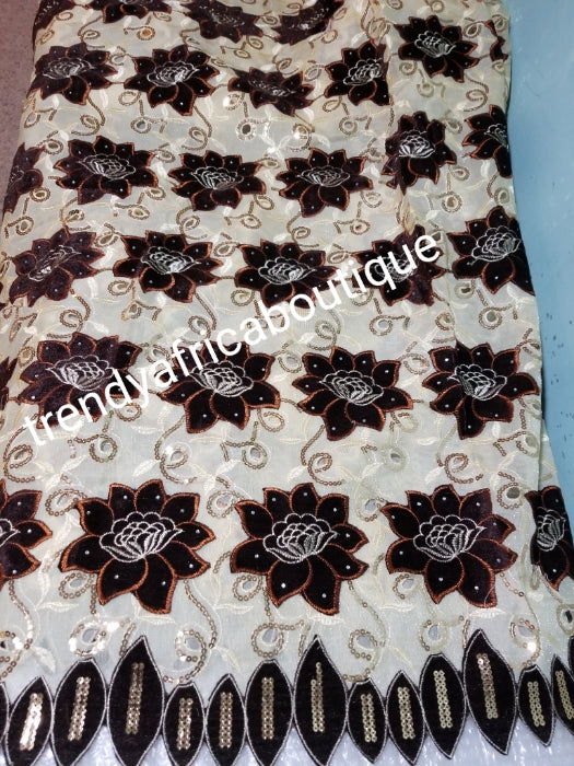 Clearance item. Beige french lace fabric embellished with chocolate brown Velvet and sequence. Beautiful border design. Sold per 5yds/price is for 5yds. Classic design