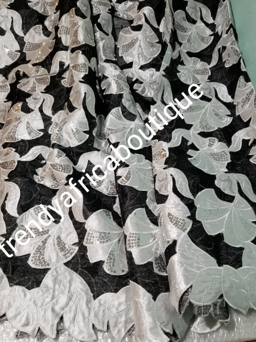 Clearance sale: black/white French lace fabric. Quality white flowered patten embriodery work, all over dazzling silver sequence. Sold per 5yds. Price is for 5yds. Beautiful African embriodery french lace- swiss quality design