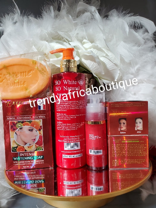 • 5pcs combo; Extreme white strong lightening body milk, soap, serum & intense  toning treatment spots removing day & Night face cream with Carrot and argan oil 30g each jar.