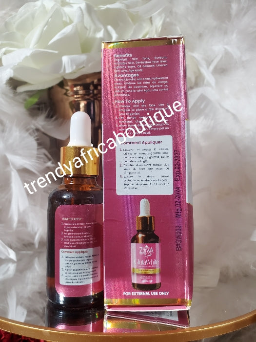 • Another banga serum: Zarwa gluta white lightening/whitening serum with Glutathion, Arbutin, kojic. Rapid action formula for ALL SKIN TYPES 50ml x. Anti sun burn, wrinkles, dark spots & scars.  Face & body. Use only at night