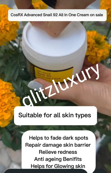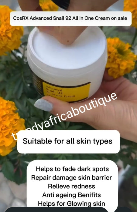 AnotherBanga!! 💯 AUTHENTIC COSRX Advance snail 92% All in one face cream. Helps to brighten the face naturally & repair. Hydrate & glow your complexion. 92% snail mucin👌👌 ALL SKIN TYPES 100ml x 1