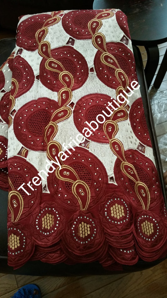 • Maroon Red/Gold embroidery swiss voile lace fabric for making Nigerian traditional wedding dress