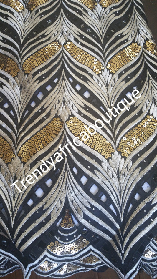• Special offer: Black/Gold/Beige Cotton Voile,  Swiss lace fabric embellished with Gold Sequence. Sole per 5 yards
