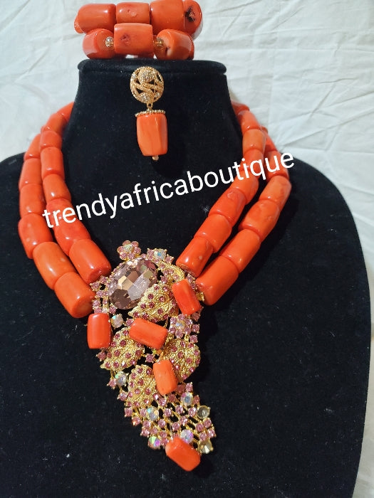 • New arrival 4pcs coral-necklace set. Latest 2 rows Nigerian celebrant beaded necklace set, 2 bracelet, Classic pendant with brown stones + coral accent.  A rear find. EDO CORAL FOR TRADITIONAL WEDDINGS/EVENT