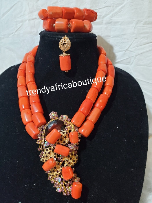 3pcs set Edo coral-necklace with pendant Traditional Bridal wedding Coral beads+earrings and one Bracelets. Exclusive Nigerian Native bead design with gold accessories sold per set. Bridal-accessories