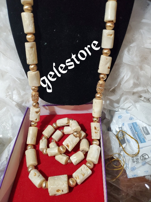 • UNISEX Off white Authentic Long 29" Edo/igbo traditional wedding/Ceremonial coral beaded-necklace set.  Includes  2 bracelet. Sold as a set, price is for set. Chunky beads from MOTHERLAND.