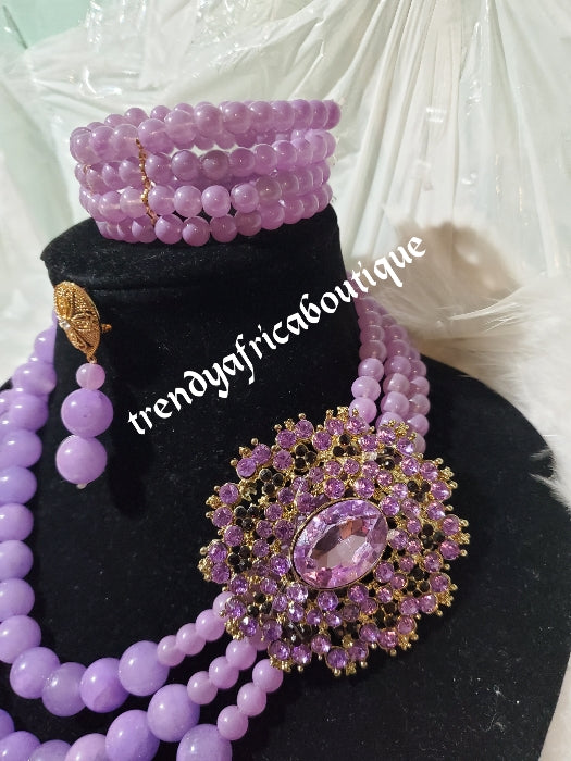 3 rows sweet lilac beaded-necklace set. Earrings, multi rows bracelets and 3 row necklace. Sold as a set. Bridal wedding accessories