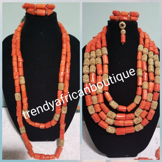 Ready to ship: Big Chunky Edo Coral beads. Original Edo coral bead set for men or women use. 2 long row with gold accent + 2 bracelet all sold together. Coral-necklace set for that special occasion such as traditional wedding.