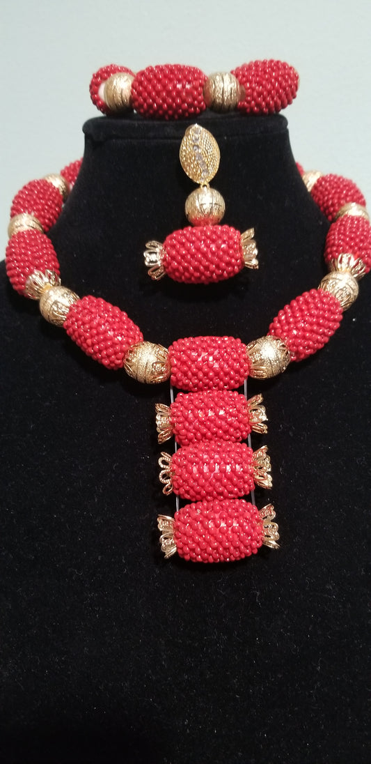 • New arrival Red beaded-necklace set. 3 pcs red coral  bead set in  Pineapple design.