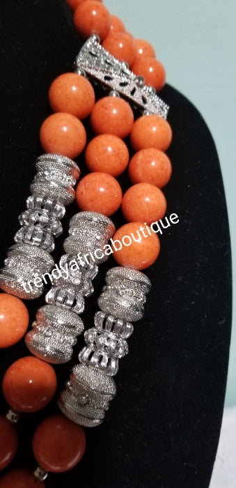 • Make to order. 3pcs Edo Coral-necklace set with silver accessories. Original Nigerian coral beads for Nigerian Traditional Ceremonies. 3 row necklace/earrins/bracelet sold as a set. Allow 3-6 weeks to receive order