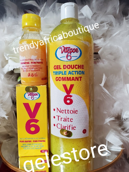 • 2pcs Vitesse 6 serum & Vitesse 6 gel douche yellow sisi (shower gel). Triple action whitening, nourishing & treatment shower gel with exfoliating properties 1000ml