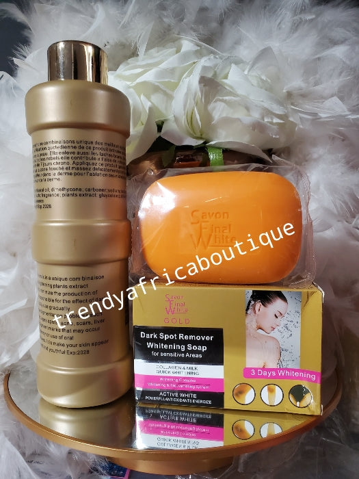 2pcs. Original final white Gold lotion & Soap with Glutathion 500ml, advance toning milk formulated with natural plant extracts. Fast acting brightening the skin safely. 500ml body lotion.